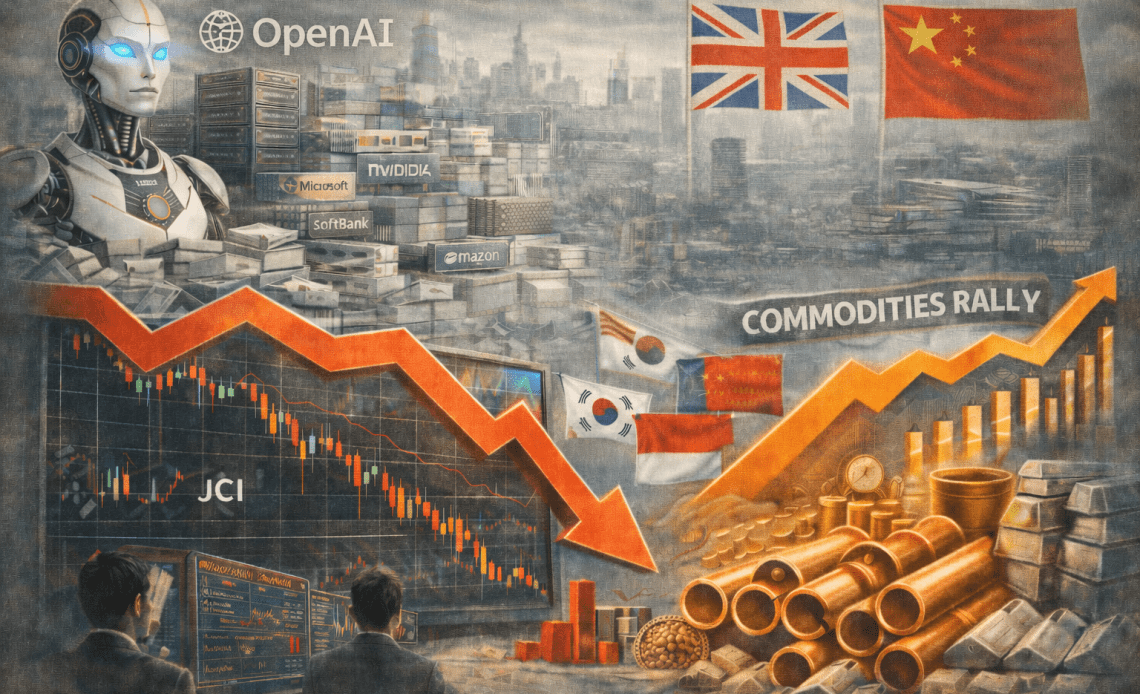 On Thursday, global markets and geopolitics were shaped by a mix of accelerating artificial intelligence investment, volatile Asian equities, renewed UK-China diplomacy, and a powerful rally in commodities.
